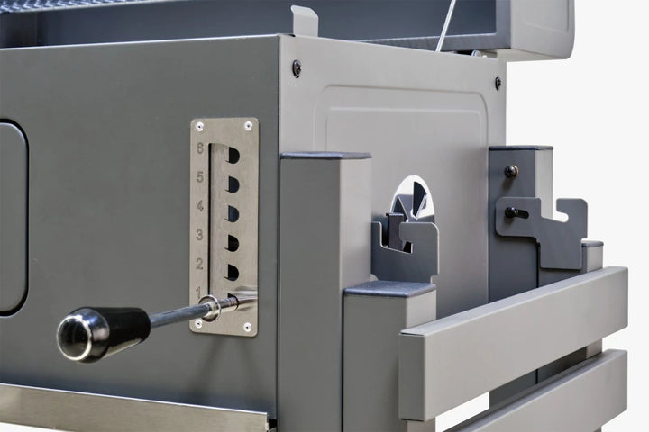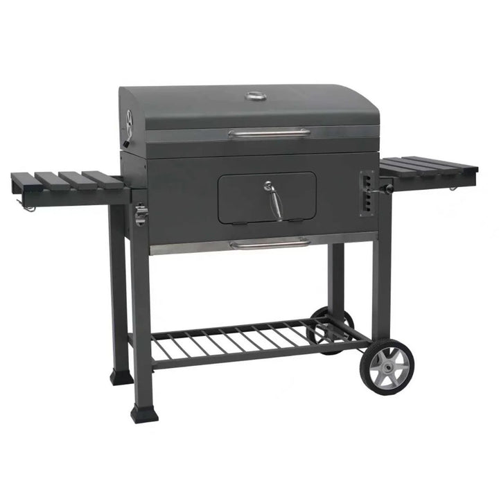 شواية فحم خارجية ذات تصميم جامبو، مصنوعة من الفولاذ الأسود، مع رفوف جانبية متعددة لتخزين الأطعمة والتوابل وأدوات الشواء. تتميز بمساحة واسعة للشواء مع إمكانية التحكم في درجة الحرارة من خلال فتحات التهوية في الغطاء. تحتوي أيضاً على رف سفلي لتخزين الخضروات أو الفحم، بالإضافة إلى عجلات لسهولة الحركة