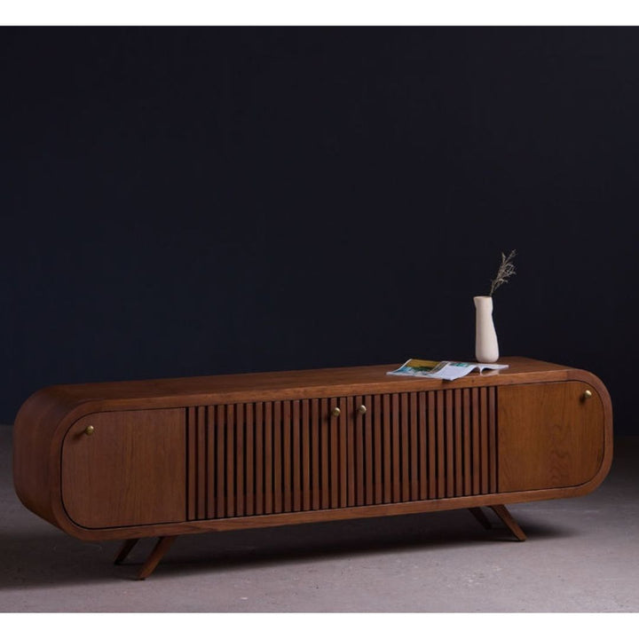 وحدة تلفزيون بتصميم عصري راقٍ يجمع بين الخامات الطبيعية والجودة العالية. مصنوعة من خشب الكونتر المتين والمغطى بقشرة الأرو الطبيعي الفاخرة التي تضفي دفئًا وأناقة على أي مساحة. بفضل عرضها الواسع، توفر سطحًا مثاليًا لتثبيت الشاشات الكبيرة ومساحات عملية لتنظيم الأجهزة والديكورات. تصميمها البسيط والمتناسق يجعلها قطعة أساسية تضيف لمسة فنية فاخرة لغرفة المعيشة من أوسكار فرنتشر.